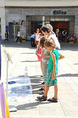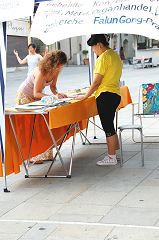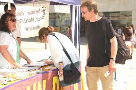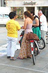 一位中年德国女士看了很久揭露迫害的图片,虽然站在炎热的太阳底下,也丝毫没有减少她要了解法轮功的兴趣。她告诉学员,当她听到他们的炼功音乐时,她就感觉浑身舒服。因为她过去也学过气功,所以她认为法轮功一定是好功法。她还要告诉她身边的朋友,让他们到网上的支持停止迫害法轮功的网站签名。