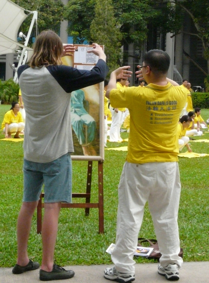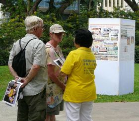 从澳洲来的一家四人来新加坡旅游一星期。他们看了真相展板,要了真相资料,坐在公园旁的椅子上观看学员们炼功。福特(Terry Ford)先生说:“这场迫害与在西藏发生的事情是一样的。”