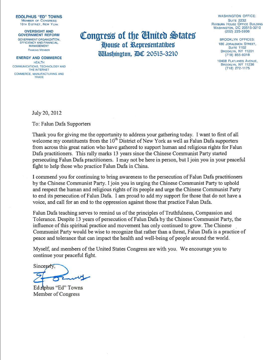 【明慧网二零一二年七月二十一日】美国国会议员艾多弗斯•唐斯 (EDOLPHUS “ED” TOWNS )二零一二年七月二十日致信法轮功学员,支持法轮功学员反迫害