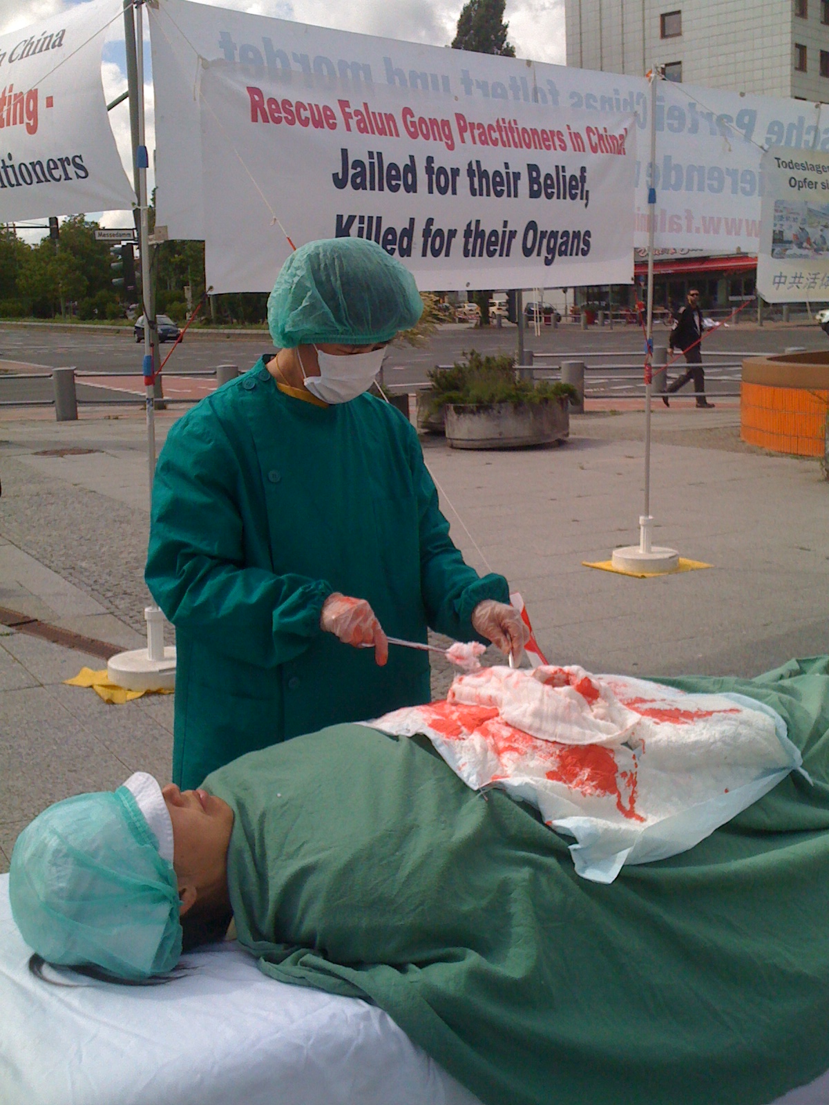 在国际器官移植会议开会地点前,法轮功学员模拟演示中共活摘器官。