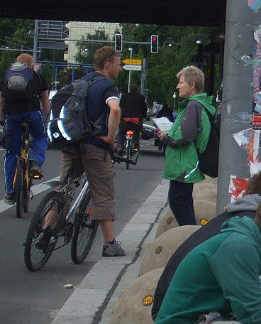'骑车人停下车,倾听法轮功学员讲述迫害真相'