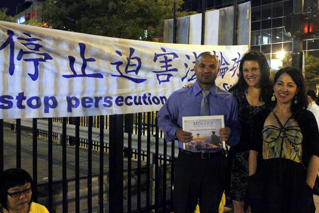 来自威斯康星州的艾米(Amy)和凯西(Kathy),看到烛光场面,不禁停下询问。当得知法轮功学员在这里烛光守夜,为悼念在中国被迫害致死的法轮功学员,艾米说:(看到这个场面)我很难过,仅仅是因为这样平和的功法?我能为你们做些什么吗?我了解一些共产党行径,我先生的家庭就是受共产党的迫害从德国逃出来的。我会帮助传递法轮功真相。