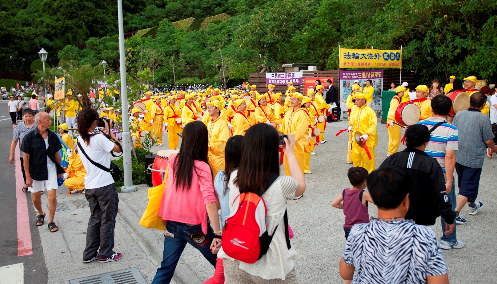 ![]() 腰鼓队和小弟子分别表演“法轮大法好”等乐曲,吸引很多大陆民众驻足聆听观看 |