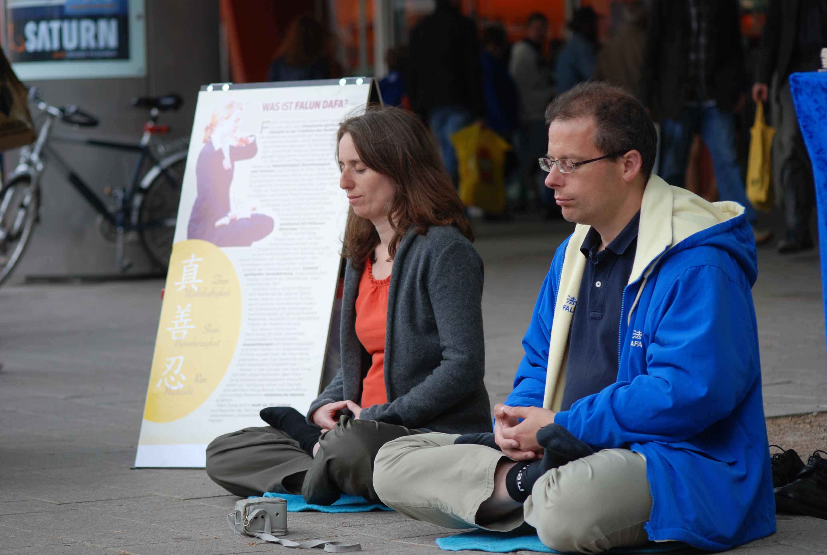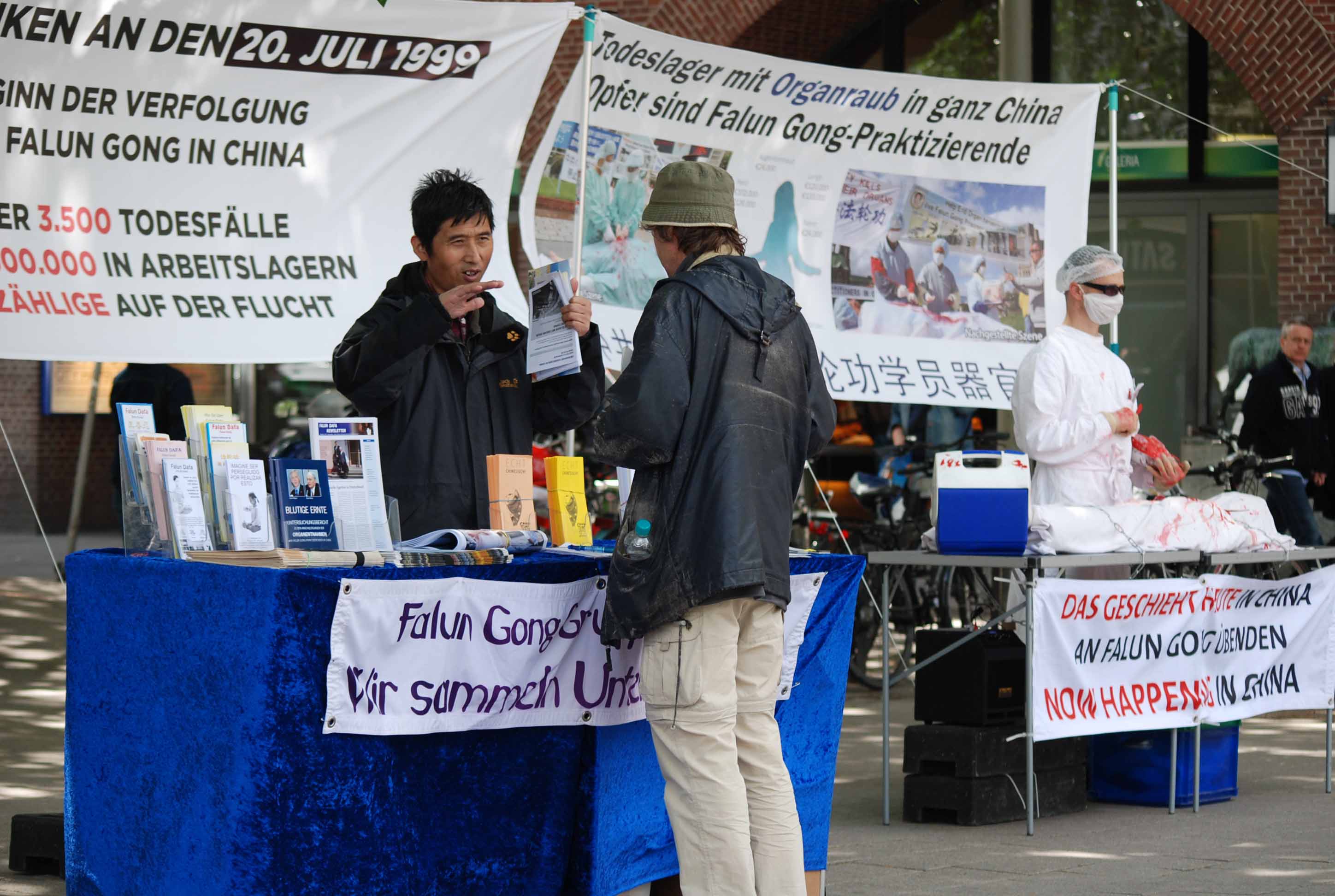 在华人经过最多的摩肯贝克(Moeckenbergstrasse)和朗莫恩(Lange Muehren)路口,法轮功学员的横幅一字排开,从左到右依次写着“法轮大法—性命双修之路 五套功法三字真言”,“从1999年7月20日开始,3500人死亡,10多万人被劳教,无数人流离失所”,“死亡营遍布中国大陆,受害者是法轮功学员”。模拟活摘器官的手术台和身穿白大褂,双手沾满鲜血的“医生”则马上引起路人的注意。不同种族和信仰的人们在惊诧中不由停下了脚步,聆听有关中共活摘法轮功学员器官的广播。