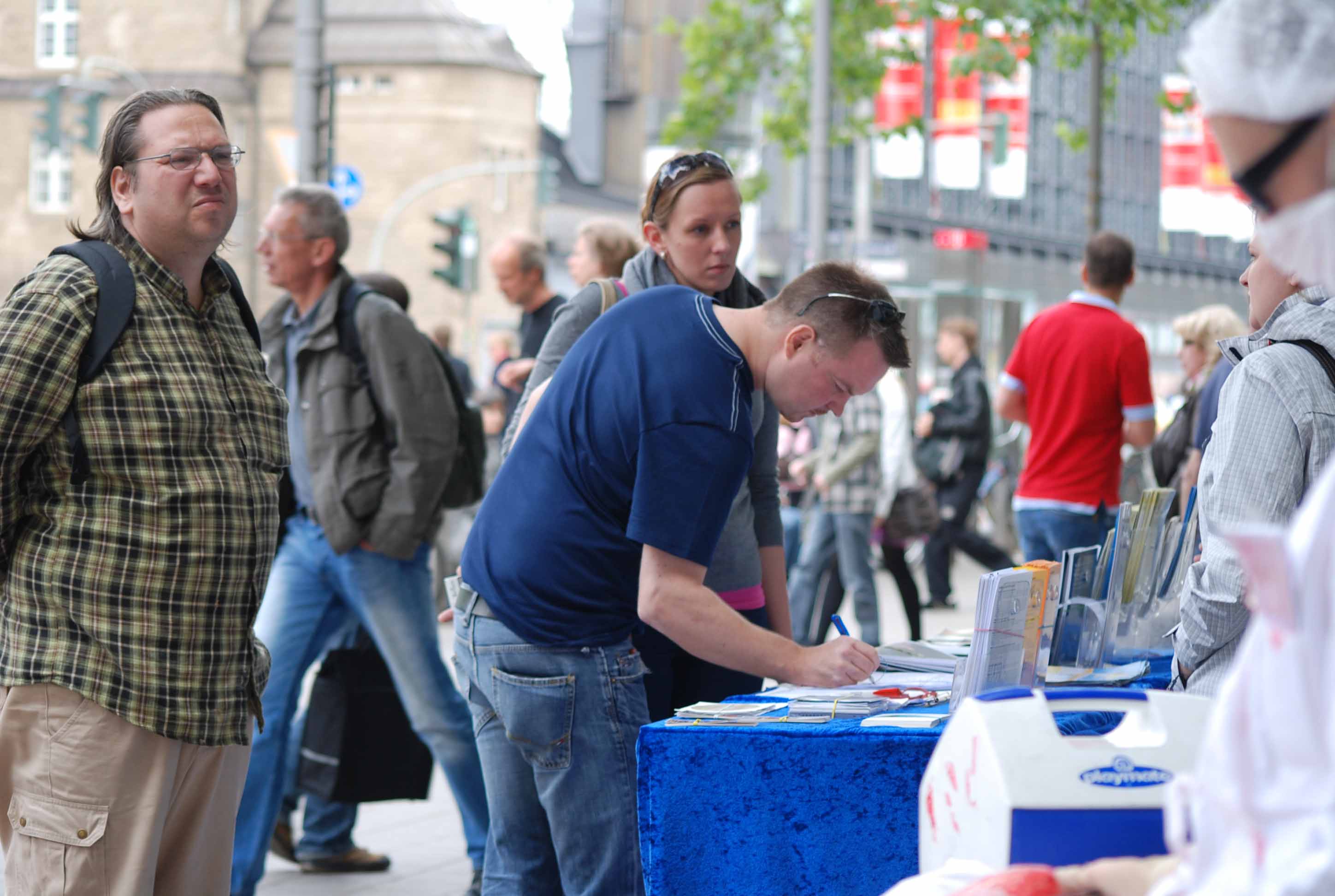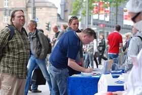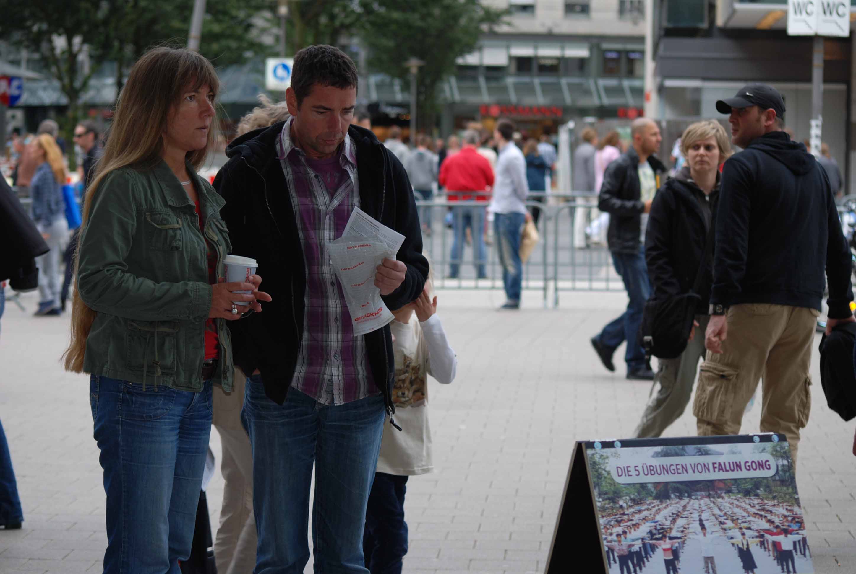 一个二、三十岁的德国姑娘和两个年轻的小伙子一起在展位前停下来。听完学员介绍后,三个人对中共的流氓行径非常愤怒。姑娘说,“我们关于这件事知道得太少了。真不理解为什么媒体上关于法轮功的事情报道的那么少。”