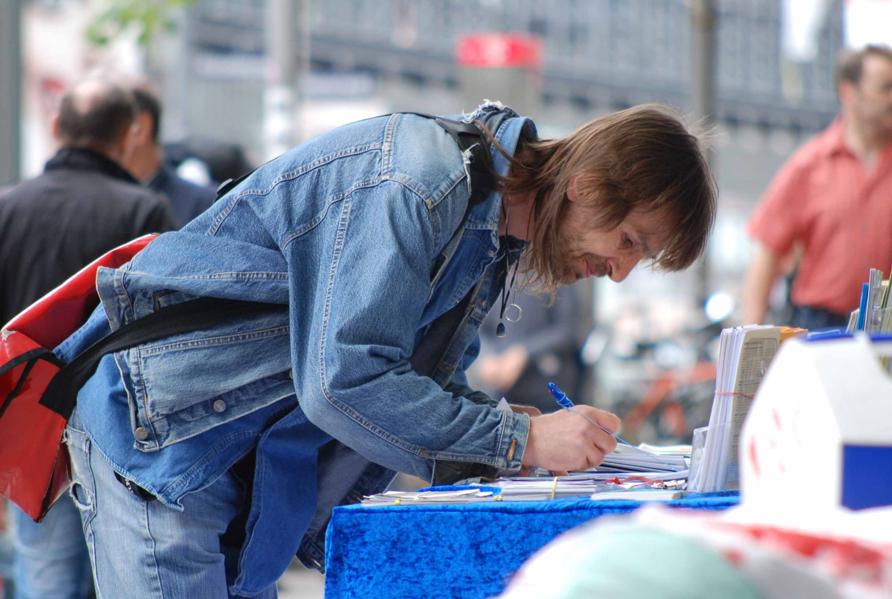一位已经有了些年纪的妇女在展台不远处观察了很久。她读完了横幅上的字后想了想,径直走到摊位前,问,“您需要我的签字吗?”签完字后,她还是难以抑制自己内心的激动,对法轮功学员说:“一点一滴的,从最小处开始。如果我们(对这样的暴行)熟视无睹的话,情况会更糟糕”。
