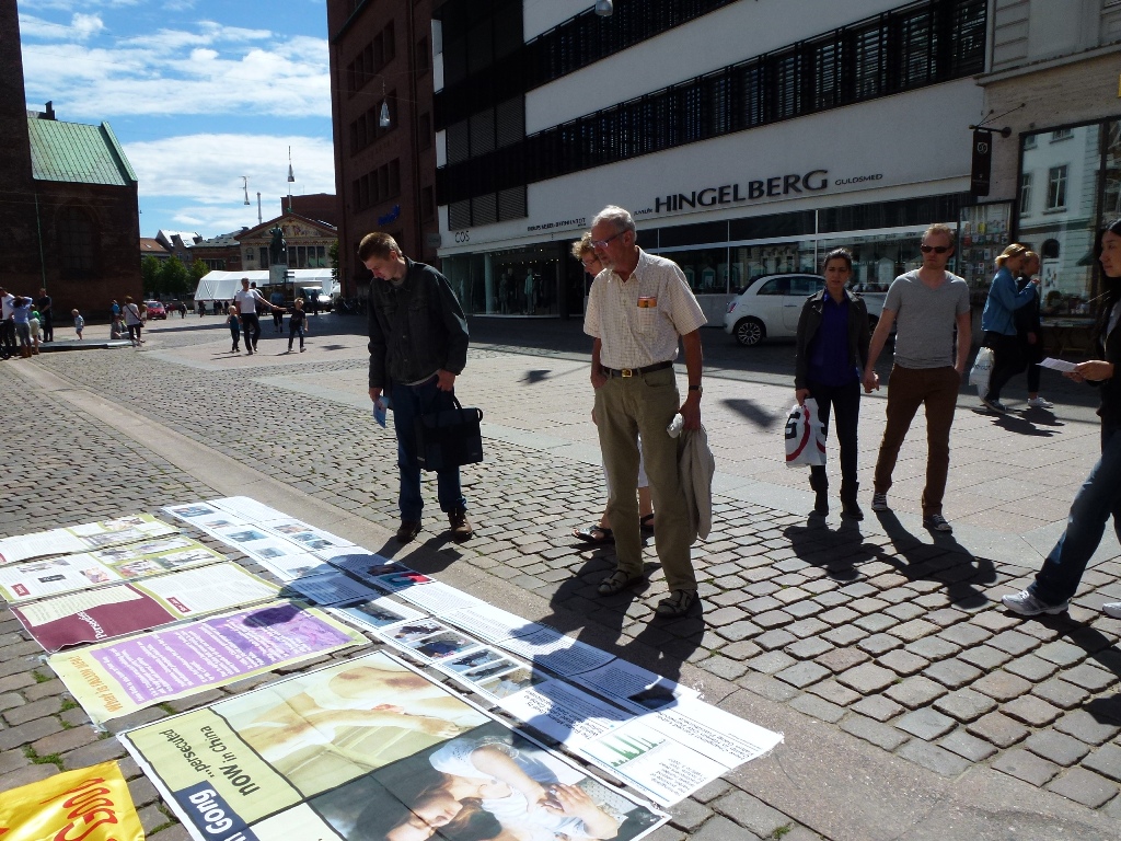一位丹麦女士路过时下意识地接了真相传单,在学员的热情询问下,她才明白自己原来以为是什么商业广告的猜想是误解。学员向她介绍大法弘传一百多个国家,法轮功学员来自全世界,以及修炼法轮功的益处后,她非常感兴趣地问道,她是否也可以学,并得到了肯定的答复,当她了解到在中国发生的活体摘取法轮功学员器官以谋暴利的罪行时,她震惊了!她说一直知道共产党很坏,但怎么也没能想象到它们居然这么邪恶。她表示一定把传单拿回家以后仔细阅读。