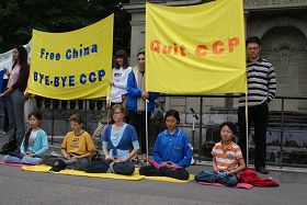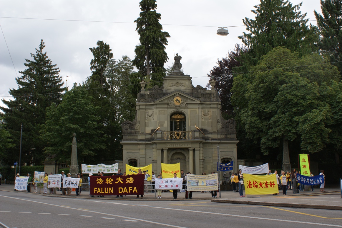 全球退党服务中心瑞士分部负责人潘女士和两名法轮功学员代表,在中共驻瑞士大使馆前发表了讲话。他们在讲话中揭露并强烈谴责中共十三年来对法轮功的残酷迫害,并且声援一亿二千万中国民众退出中共的党、团、队组织。他们指出,中共已经穷途末路、苟延残喘,即将解体。并且呼吁国际社会站在中国人民一边,支持解体中共,停止迫害法轮功。