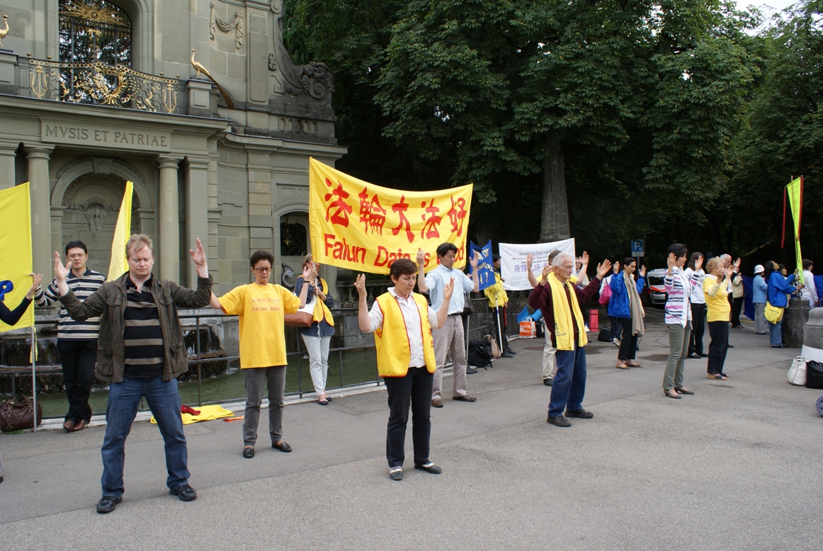 【明慧网二零一二年七月二十三日】二零一二年是中共法轮功十三年,七月二十一日,瑞士法轮功学员在瑞士首都伯尔尼突恩广场举行集会,揭露中共十三年来对法轮功的残酷迫害。他们打出“法轮大法好”、“天灭中共”、“法办江泽民、罗干、刘京、周永康”等横幅,并向路人散发真相材料和演示法轮功功法。许多开车经过的亚洲人士和西方人士,在车中竖起大拇指或者打着胜利的手势表达他们对法轮功学员的支持。