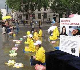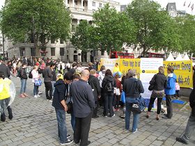 距离二零一二年伦敦奥运会开幕还有一星期,当天鸽子广场聚集了大量来自世界各地的游客,法轮功学员纪念反迫害十三周年的活动,成就了来自不同国家的广大民众认识法轮功真相的机缘。