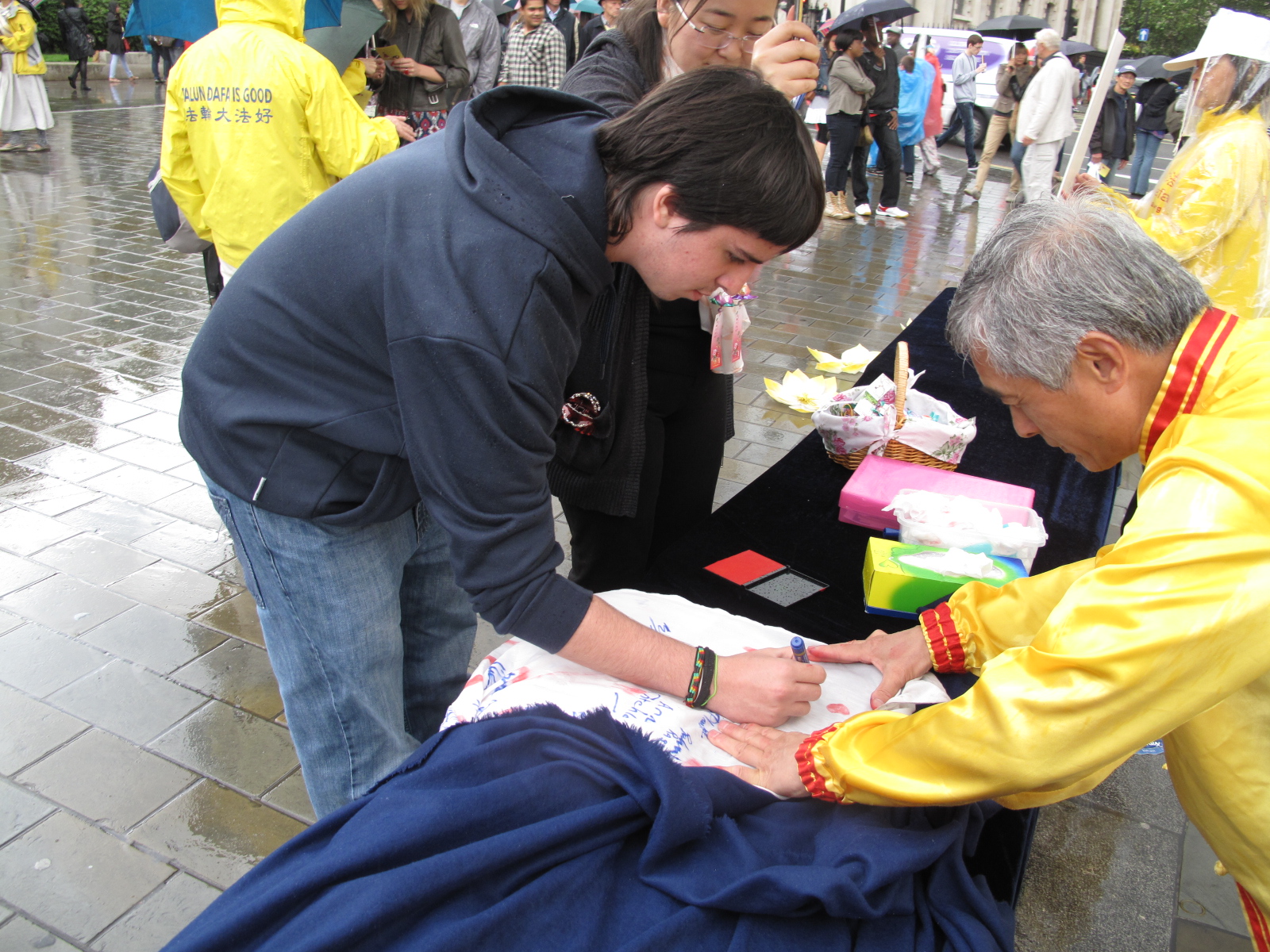 这天,伦敦的雨下下停停,法轮功学员在六、七个小时的活动中一直在不间断地展示着法轮功五套功法。身着金黄色练功服、黄色体恤或黄色风雨衣的学员们,在主要街口而立,他们的脚下还摆放着一排七彩的手工莲花,整个画面的鲜明色彩让人们在很远就能看得见,宁静祥和的炼功场面吸引着无数目光,人们停下脚步感受着炼功人传递出的平和能量。法轮功学员在雨中的坚持更是令人感动。