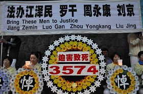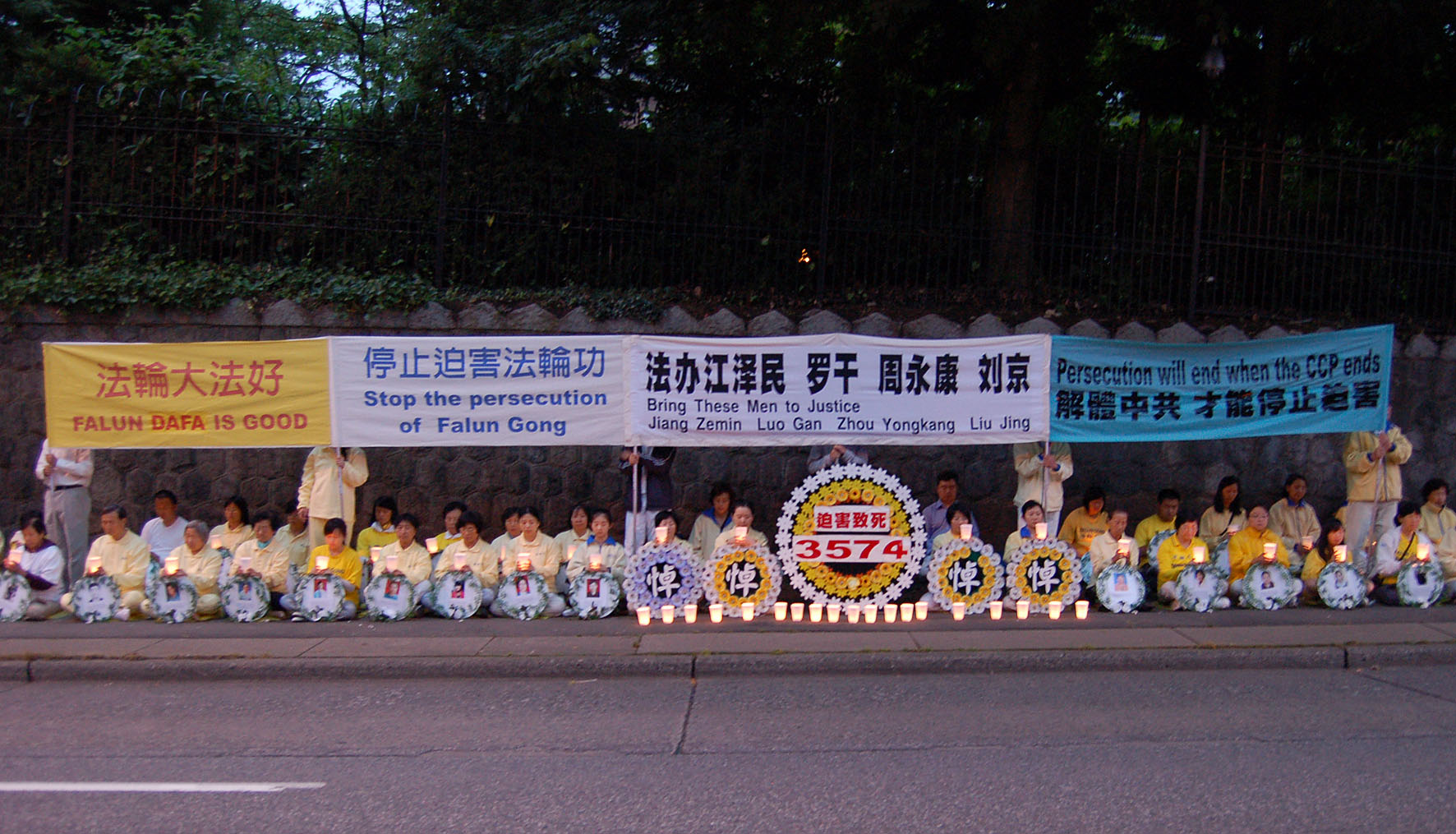 中领馆前的马路边,车流如水不断,十三年来,温哥华民众都知道法轮功学员的遭遇,与他们的和平抗议方式,当晚经过时纷纷鸣笛表示支持,或缓缓而行注视着眼前的肃穆场面。法轮功学员手捧上百个花圈,悼念三千五百七十四名有名有姓在中国被迫害致死的法轮功学员。