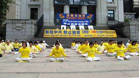 二零一二年七月二十一日中午,近百名加拿大温哥华法轮功学员聚集在温哥华市中心艺术馆广场进行集体炼功,告诉世人展现什么是法轮功,及中共迫害法轮功的真相。