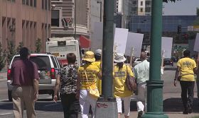集会过后,法轮功学员手举真相展板在丹佛市中心举行了反迫害步行活动,穿梭于车水马龙的街道上,吸引了很多行人的目光。许多来自世界各地、特别是中国大陆的游客借此了解到法轮大法的美好,中共迫害法轮功的真相以及法轮功学员在过去十三年中反迫害的历程。