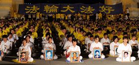二零一二年七月二十二日晚七点后,一千多名法轮功学员在自由广场牌楼下举办“拯救善良 结束迫害”烛光悼念会