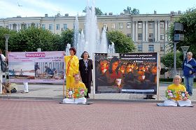 二零一二年七月二十日,俄罗斯圣彼得堡法轮功学员,在俄中使馆附近的芬兰火车站最繁华的广场上,进行了一周的每天弘法活动。