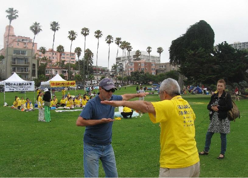 拉荷亚海滨公园里,游客当场学炼法轮功