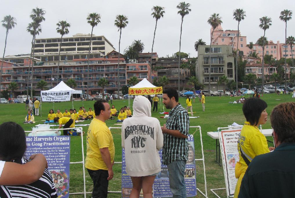 拉荷亚海滨公园里,法轮功学员向过往行人揭露中共迫害