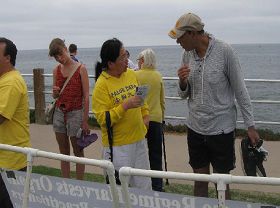 在集体炼功的同时,部份法轮功学员在海岸边的草坪上铺开真相展板,向过往行人揭露中共邪党对法轮功的残酷迫害。