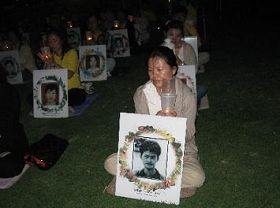 晚上八时,夜幕降临,法轮功学员们点燃蜡烛,捧起被中共迫害致死的中国大陆同修们的照片,在“请与我比邻而坐”的歌声中,开始了烛光悼念仪式。庄严肃穆的烛光里,大家和失去父亲的玛丽(MARY)、失去外公的思侬一起,默默地落泪,缅怀同修。一位路过的美国小伙子,受肃穆气氛感染,也默默坐在了学员身旁,拿起了蜡烛……