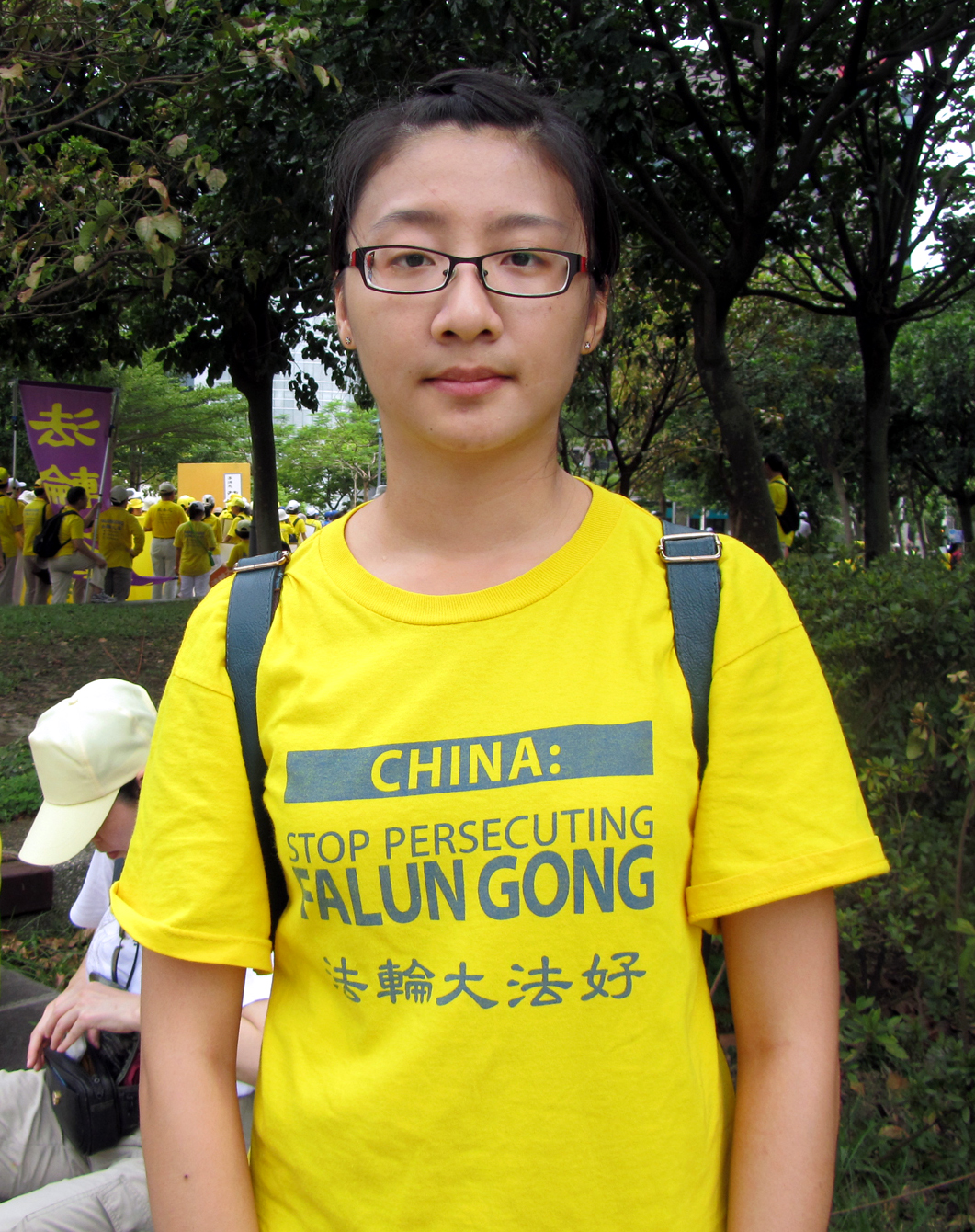 花莲东华大学音乐系大三学生张雅翔,灿烂芳华可已经是资深老学员了,她从幼稚园便与父母一同修炼法轮功,今天特地从花莲赶来台北参加这场盛会。张雅翔说:“七•二零是中共对法轮功开始残酷迫害的善与恶的分水岭,也是全球法轮功学员反迫害的一个很重要的日子,所以我特地赶来参加,目的是想让更多人知道法轮大法弘传世界各国,受到欢迎与肯定,可是在中国大陆却遭受无理的打压与残酷的迫害。凭借这个活动,希望让更多人了解法轮功以及在中国被迫害的真相。”