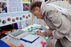 【明慧网二零一二年七月二十五日】二零一二年七月二十日,俄罗斯圣彼得堡法轮功学员,在俄中使馆附近的芬兰火车站最繁华的广场上,进行了一周的每天弘法活动。二零一二年也是法轮功反十三周年的日子,学员们为这一天还印发了新的真相资料。