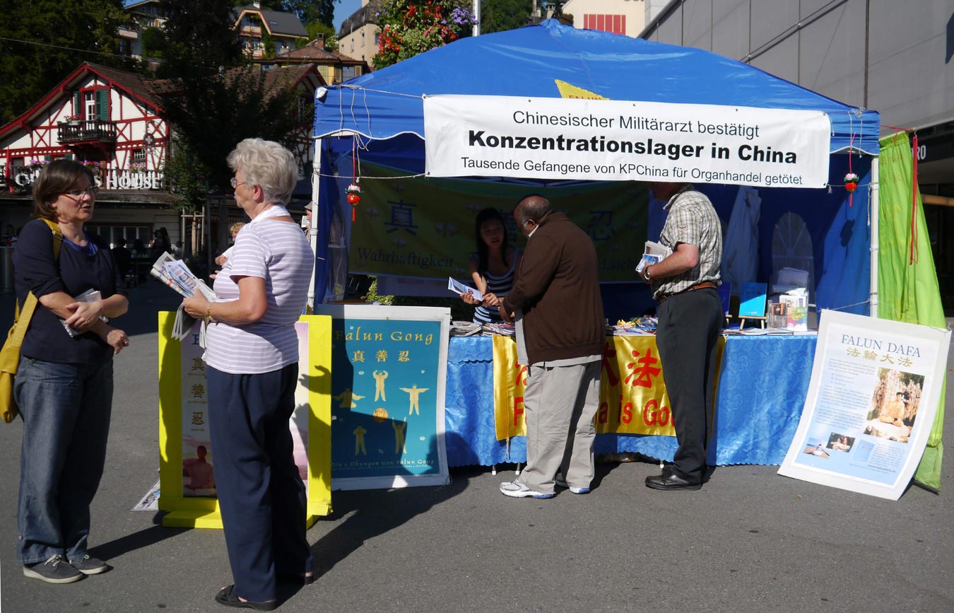 【明慧网二零一二年七月二十六日】二零一二年七月二十三日,法轮功学员再次来到瑞士卢赛恩的狮子广场举办每月一次的传送法轮功真相的信息日。展出的横幅中祥和的炼功场面和学员们被中共迫害得伤痕累累的照片,成了鲜明的对比。中德两种文字的横幅向人们揭露中共活摘法轮功学员器官的罪行。