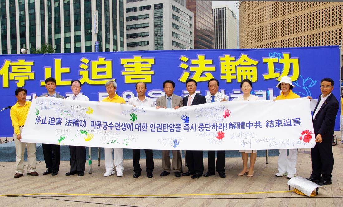 【明慧网二零一二年七月二十六日】二零一二年七月二十二日,韩国多家市民团体、政要及法轮功学员一同于首尔广场举行联合集会,谴责中共对法轮功长达十三年的人权迫害。与会者表示,中共迫害法轮功所犯下的反人类罪行及其活摘器官的暴行已经引起全球瞩目,“只有解体中共,才能结束迫害”已成各界正义人士和团体的共识。与会者呼吁社会各界在历史的关键时刻莫做看客,站在正义和善良的一边,为自己和家人选择美好的未来。