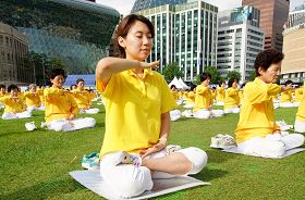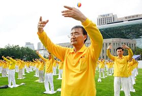 法轮功缓慢圆的五套功法,简单易学适合各年龄层的人学炼。图为首尔广场前绿色的草坪上法轮功学员炼功身影。