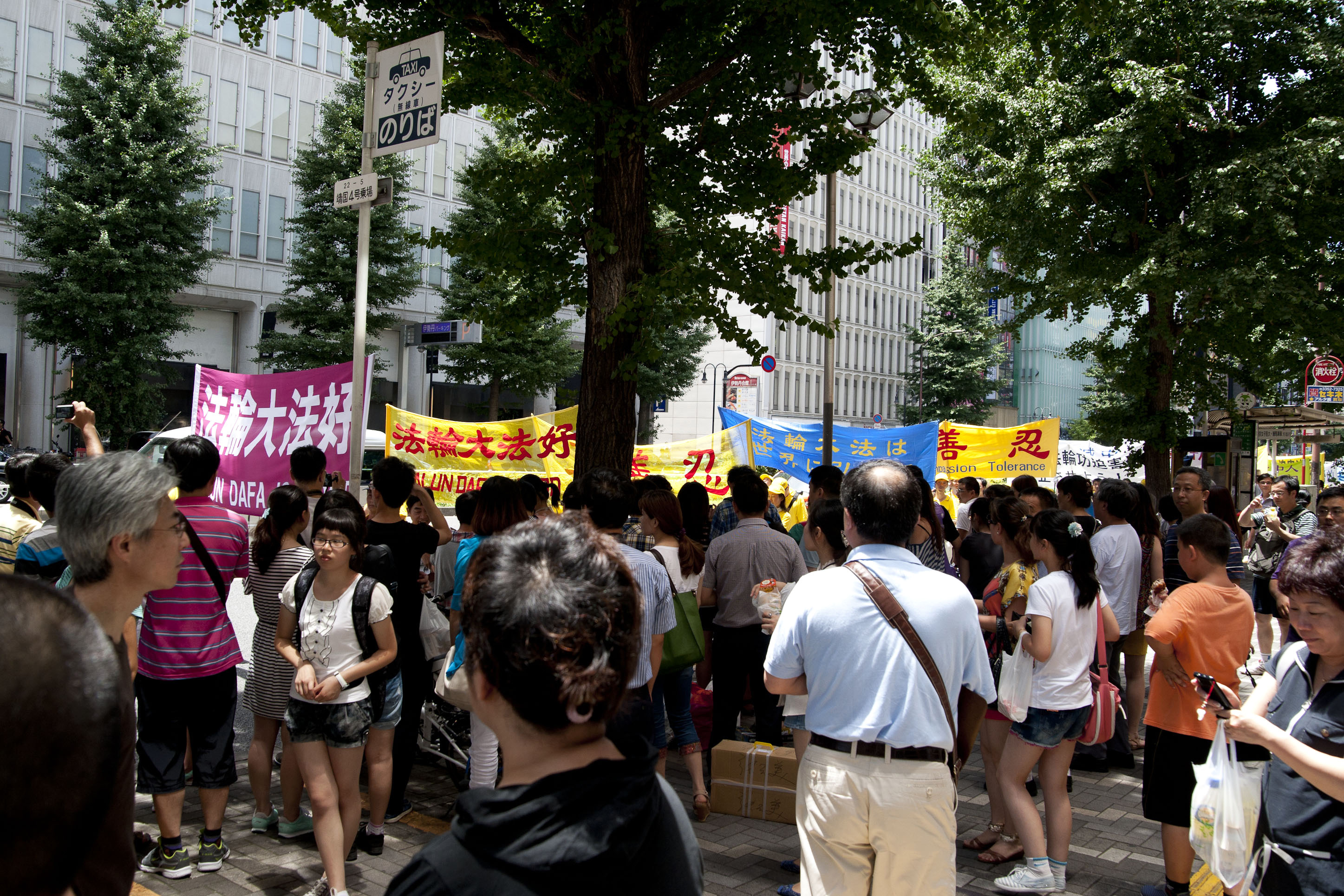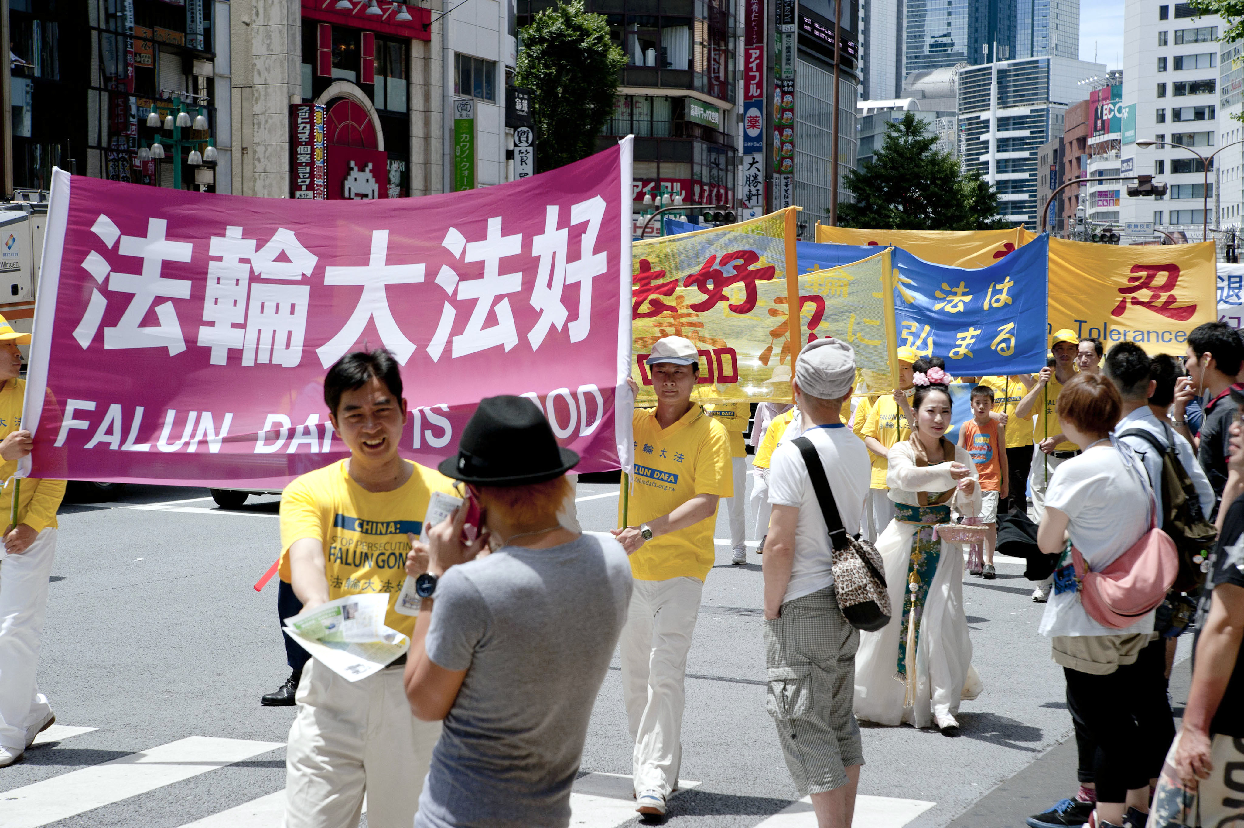 十六日,烈日当空,法轮功学员们齐聚在东京繁华的新宿大久保一带,举行了反迫害集会和游行。队伍打出中日文各色条幅和标语,天国乐团的雄壮演奏十分引人瞩目,沿途商家和行人以及中国大陆的观光客们纷纷驻足观看和拍照。很多人从学员手中接过传单,认真阅读。