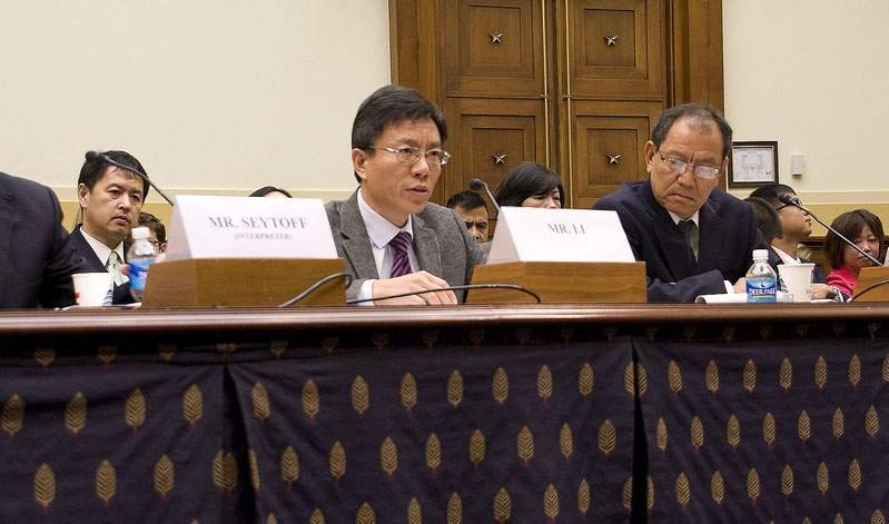 ![]() 法轮功学员李海(中)在美国国会听证会上揭露中共迫害 |
