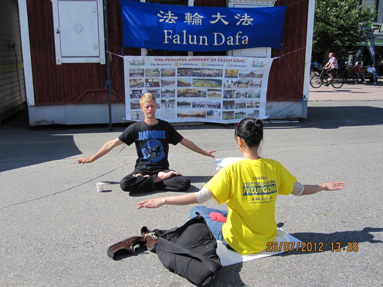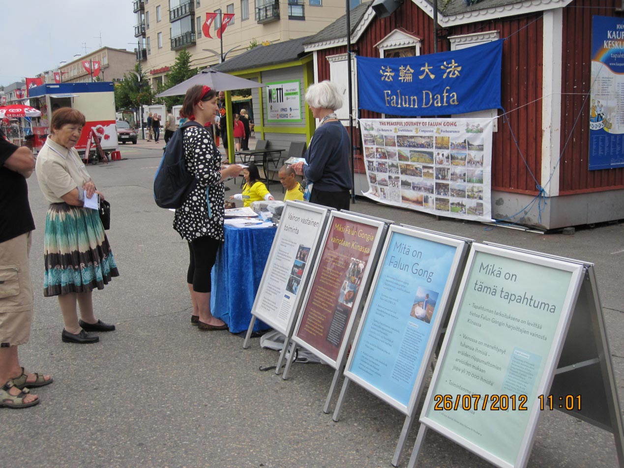 【明慧网二零一二年七月二十九日】二零一二年七月二十六日,芬兰法轮功学员来到位于芬兰东部的约恩苏市(Joensuu)市中心举行一天讲真相活动,告诉人们法轮大法在世界弘传,并揭露中共迫害法轮功的真相。了解真相后的人们排队在“支持法轮功学员反迫害”本上签名。还有年轻人在观看学员演示功法时,跟着学炼五套功法。