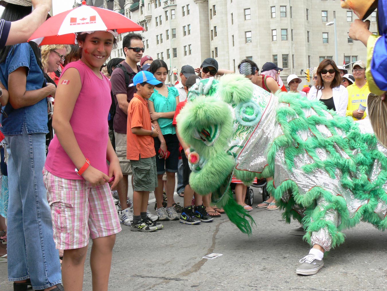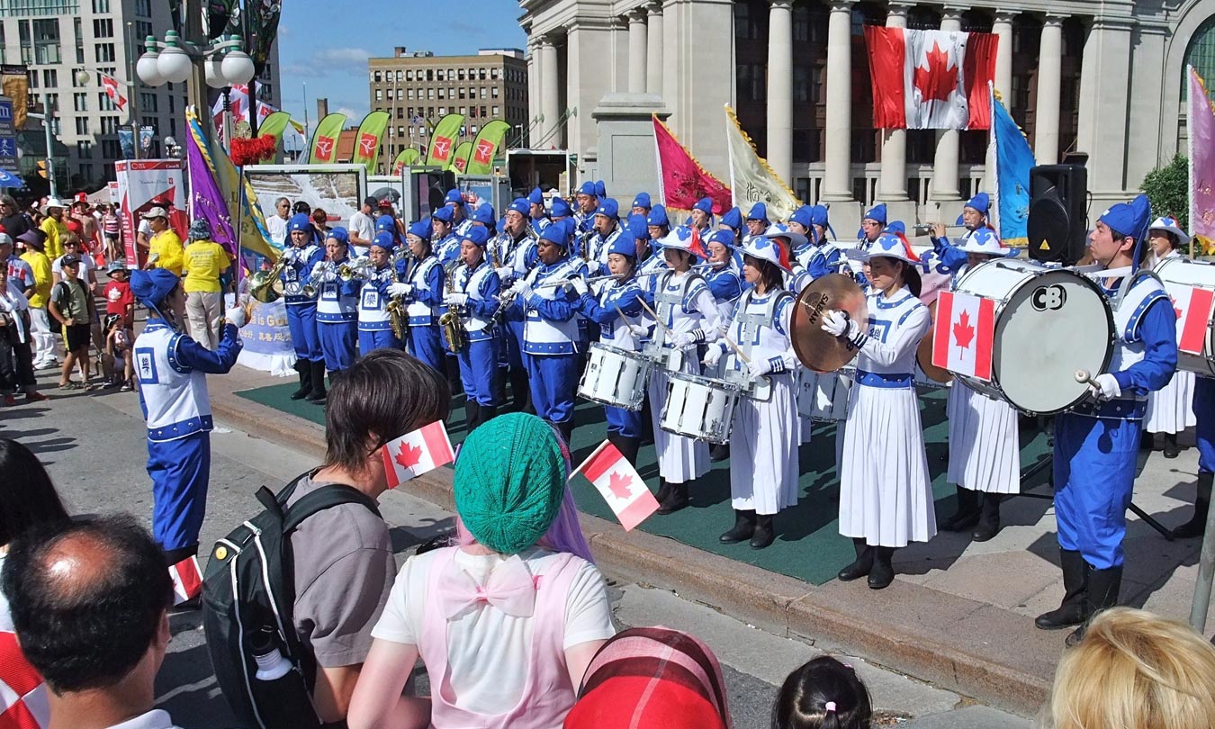 来自渥太华、蒙特利尔和多伦多的法轮功学员为成千上万的加拿大人表演了腰鼓、中国古典舞、新疆舞和狮子舞,天国乐团演奏了《法轮大法好》、《法鼓法号震十方》、《法正乾坤》、《送宝》、《法轮圣王》和《永远的枫叶》等曲目。