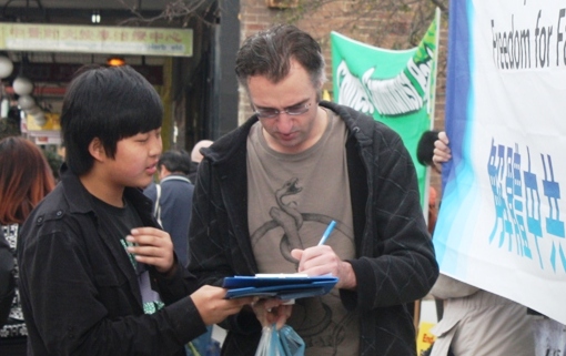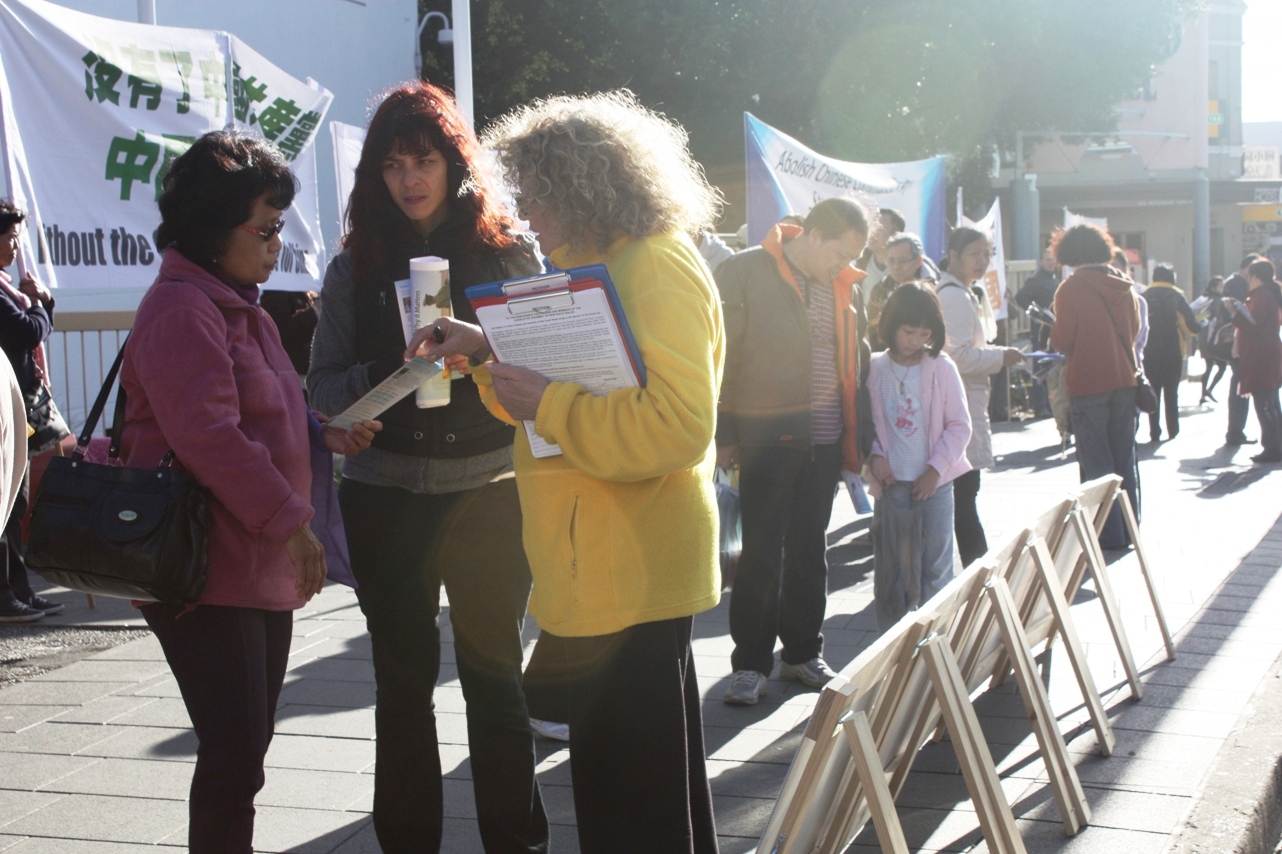 法轮功学员梅瑞(Merry)告诉记者:“一些有素养的华人跑过来对我说:‘我签字支持你们。记住,中共是最坏的,我最恨它!’还有个华人跑过来问:‘什么时候中共灭亡哪?快一点啊!我们巴不得它快点灭亡,你们法轮功加油啊!’另外一个华人跑过来主动签名后还说:‘你们以前没有这么多人在这里,请你们以后多来,让我们多来看看多了解一点,这是一道风景线啊!’”