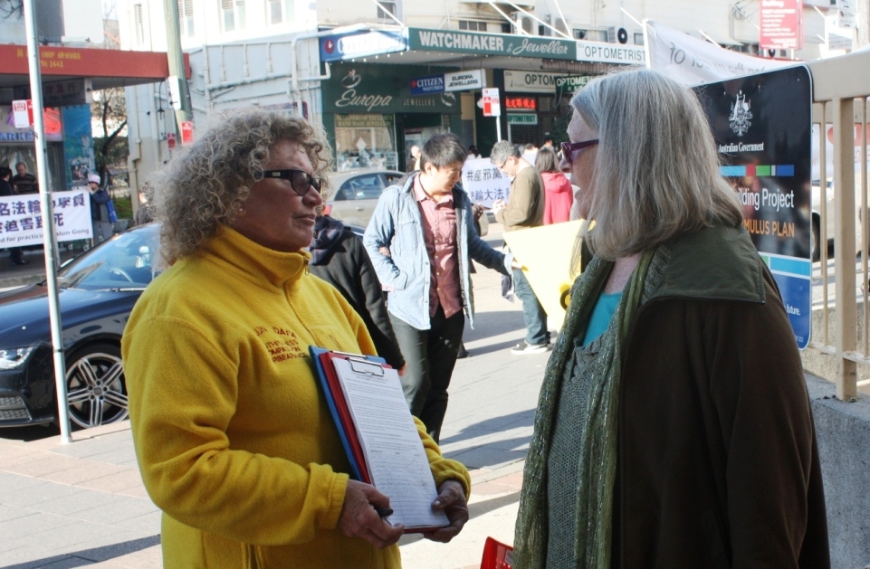 澳洲西人简路过时,与西人学员科琳(Colleen)攀谈起来。简表示,自己几年前听说法轮功遭到迫害。几年过去了,迫害还在继续,这令她很吃惊。