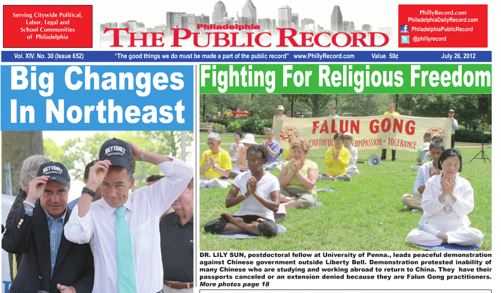 费城的《公共纪录报》(The Public Record)在七月二十六日刊登了该活动的图片报道,标题是“为宗教自由而奋斗”(Fighting for Religious Freedom)。报道中说:“法轮功由创始人李洪志于一九九二年在中国第一次公开传授。他是一种精神信仰,融合了打坐、气功的舒缓动作和道德理念。但中国政府却禁止修炼。”“在世界各地领事馆的中国官员拒绝给出禁止的原因或法律根据。”