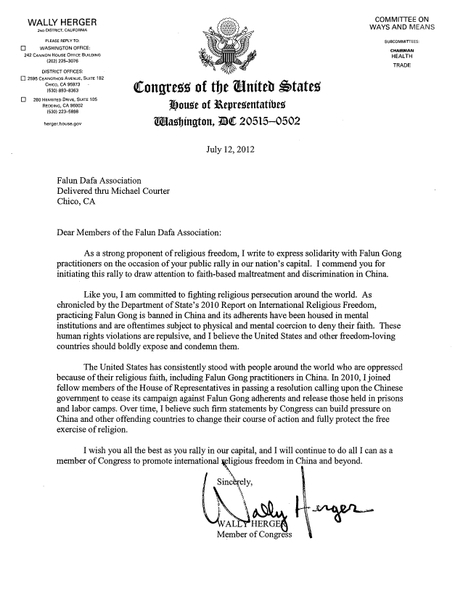 美利坚合众国一直以来与世界各地,包括中国法轮功学员在内的那些因信仰而被压迫的人民站在一起。在二零一零年,我与众议院的其他议员一起努力通过了一项呼吁停止中国政府对法轮功修炼者迫害并且要求释放所有在监狱及劳改营的法轮功修炼者的决议。持之以恒,我相信国会这样坚定的表态会给中国以及其它违犯人权的国家压力,让他们改变行为并且保护宗教自由。