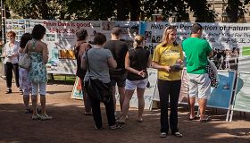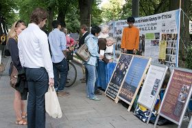 人来人往的大道旁立着“法轮大法洪传世界”及“呼吁停止迫害法轮功”的横幅,几块展板整齐地摆放在征签桌的旁边。“法轮大法”横幅前,几位学员演示着功法。祥和的功法吸引着一批又一批的游人观看,展板前的人们震惊于发生在中国的迫害的残酷,纷纷谴责中共暴行。