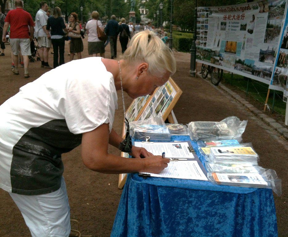 芬兰女士马尔萨(Marsa)看过展板后很震惊。她说那些揭露中共迫害法轮功的图片真正地触及到了她的心灵,她感到非常难过。她问学员,她能不能把横幅照下来。“我能够为法轮功做些什么?”她真切地问道。当她得知学员们在征集反迫害签名时,马上表示很愿意签名。在临走时,她还上前紧紧地拥抱了学员,希望他们一切都好,希望他们能坚持直到迫害结束。