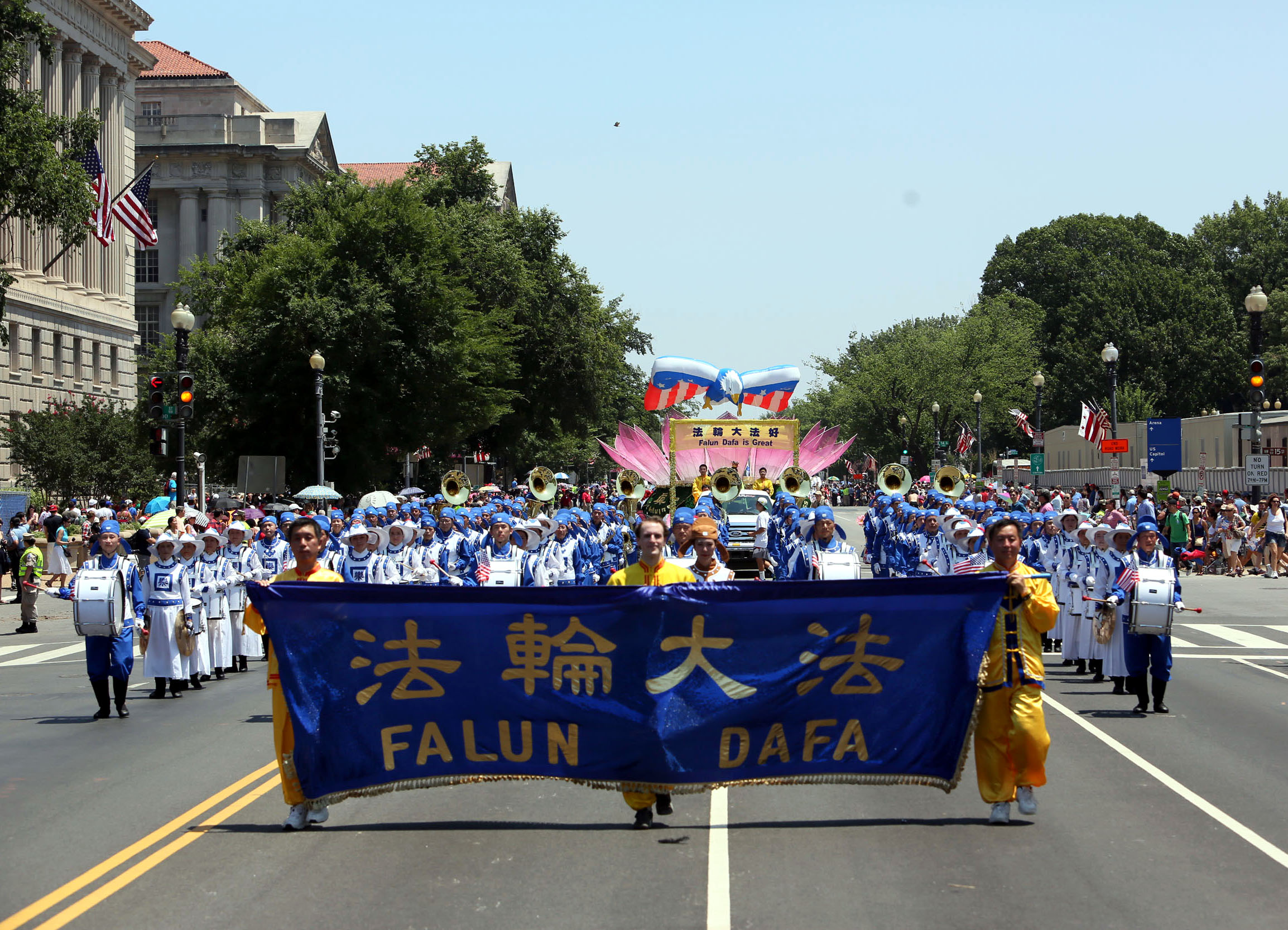 大约一百个来自全国各地的团体获选参加今年的华盛顿独立日游行。今年是法轮功学员第十一次应邀参加国庆游行。由天国乐团、莲花花车和仙女队组成的法轮功游行队伍是所有团体中规模最大的一个。在宪法大道沿途观看游行的各族裔民众惊叹不已,拍手叫好,第一次见到天国乐团的人们更是兴奋不已,纷纷举起手中的照相机,拍下这难得一见的场面。