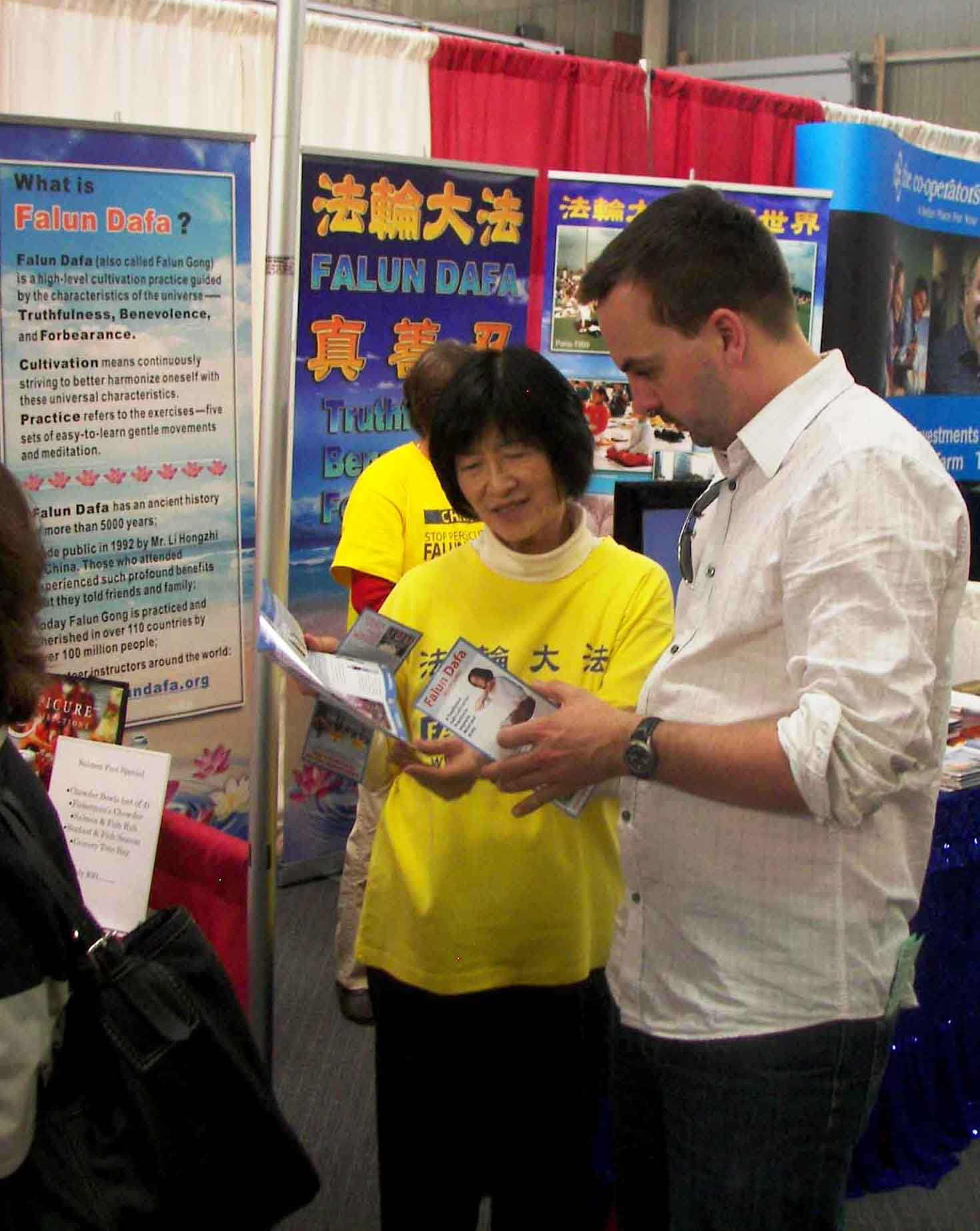 ![]() 民众在在列治文贸易展的法轮大法展位停留,询问相关信息 |
