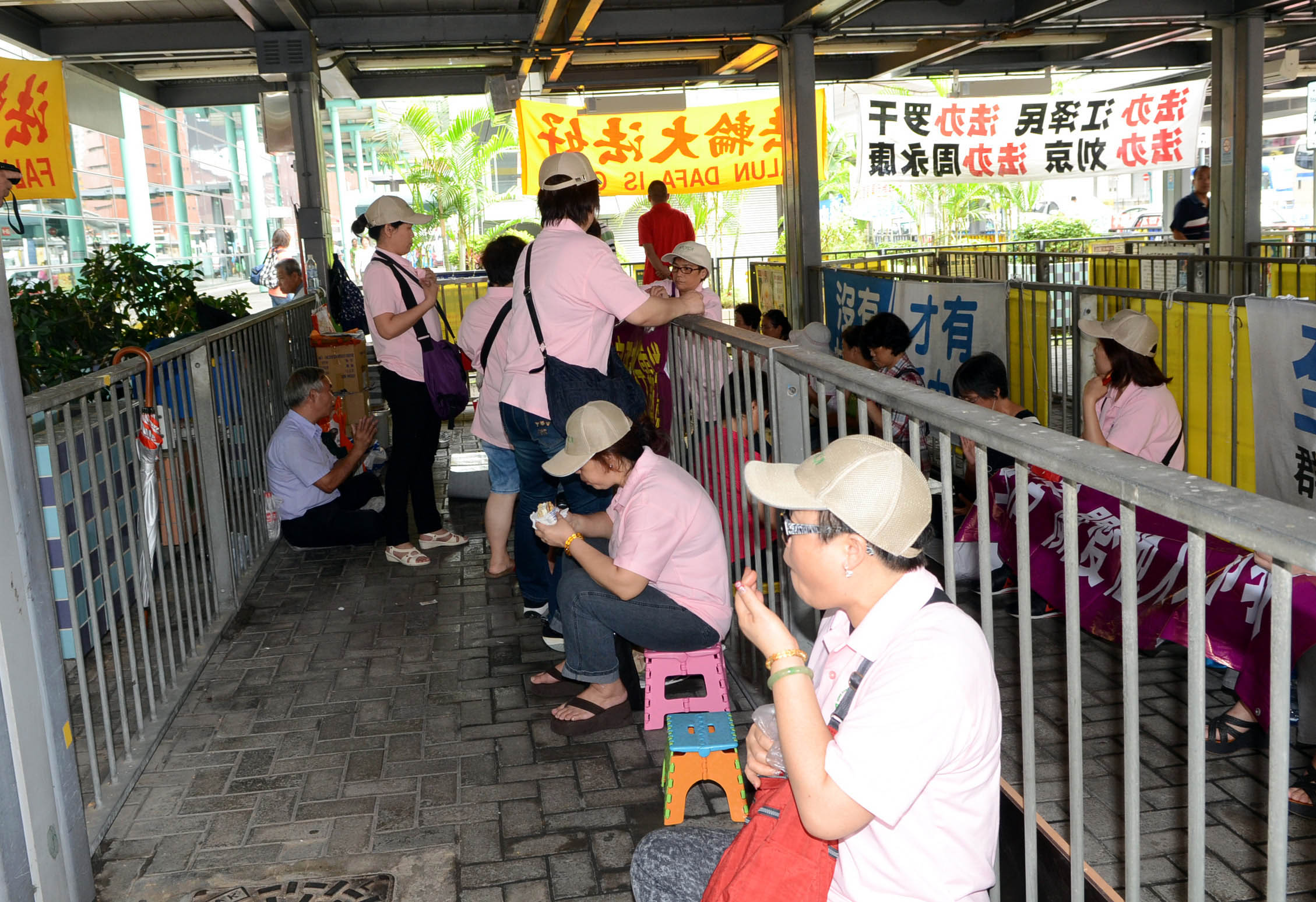 ![]() 穿着粉红色制服的“香港青年关爱协会”中共帮凶,用带来的横幅掩盖法轮功学员的横幅,故意挑衅香港法轮功学员。 |