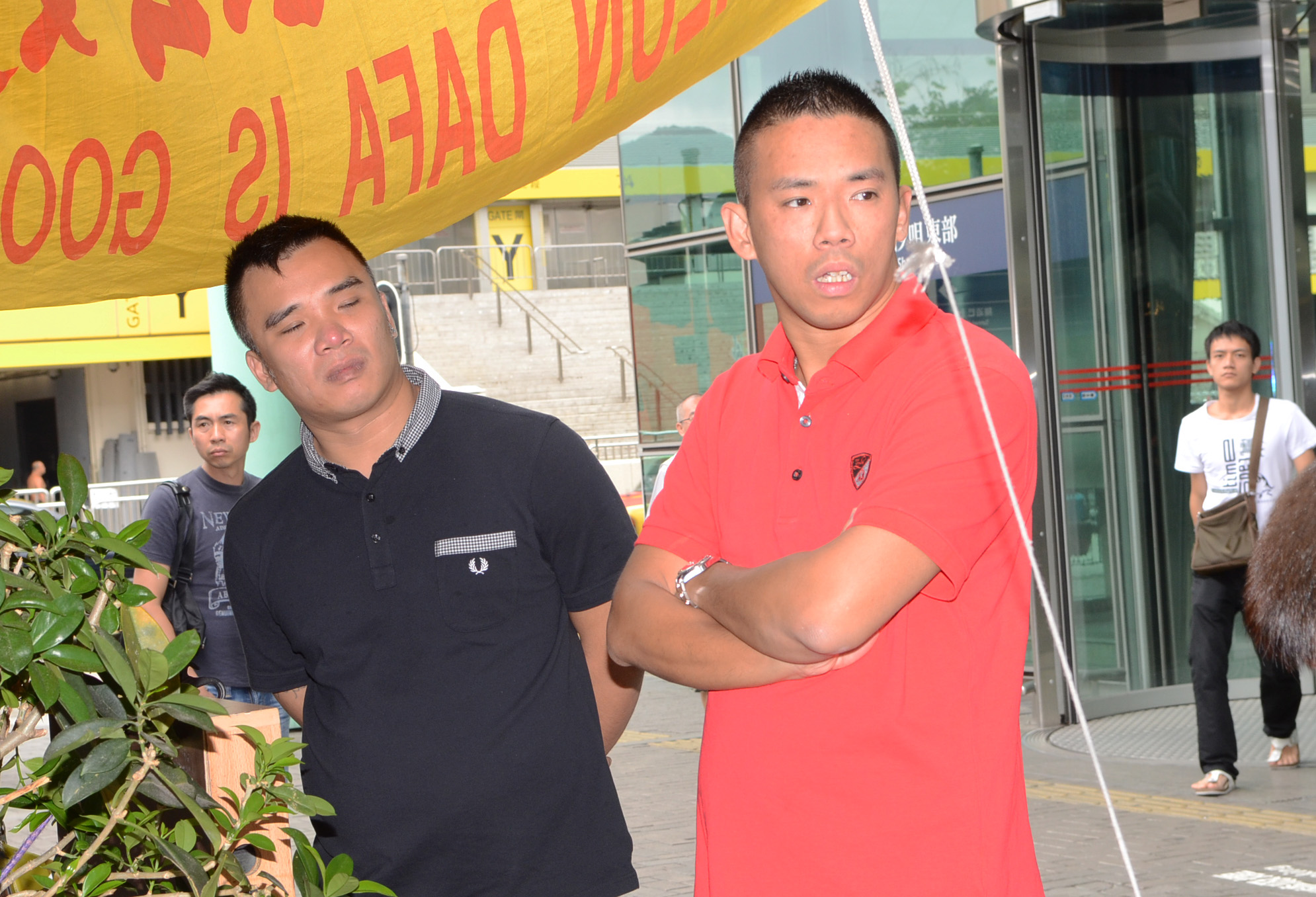 ![]() 十多名身穿粉红色统一制服,上印香港青年关爱协会的帮凶,十九日冲进法轮功学员真相点内,四处悬挂污蔑横幅,又大摇大摆吃东西,用尽各种方法挑衅。 |