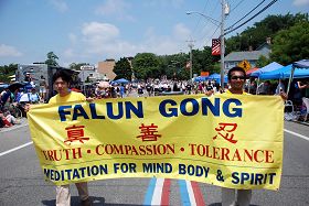 法轮功的游行队伍所到之处,更吸引那些中国面孔的观众,有的不停的在队伍面前照相,还有的挥手致意。一位从布朗来的亚裔学生跑到队伍面前,询问中共为什么迫害法轮功。她说,自己的父母是六四时期从中国大陆逃出来的学生,知道中共的谎言和暴政。学员回答了她的疑惑后,她才满意的离开了。