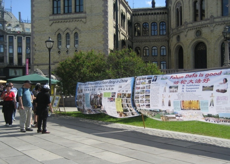 【明慧网二零一二年八月一日】自二零一二年七月二日开始,挪威法轮功学员在首都奥斯陆的国会前举行为期一个月的讲真相活动,揭露中共对法轮功长达十三年的残酷迫害。七月份是挪威的旅游旺季,醒目的真相展板和横幅吸引了来自世界各地的游人及本地居民驻足观看。人们纷纷接传单,签名谴责迫害,更有中国游客声明退出中共党团队。
