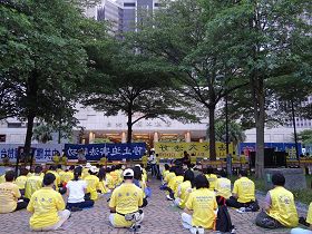 八日傍晚,君悦饭店的对面,法轮功学员拉起“法轮大法好、停止迫害法轮功、中共应立即释放台湾法轮功学员钟鼎邦”等横幅。越晚聚集的学员越多,他们下了班后陆续赶过来。学员中有公务员、律师、会计师、资讯工程师、大学教授、高中及国中教师、自己做生意的老板、大学生、高中生、国中生及小学生等等,法轮功学员涵盖各阶层各行业的人,都在法轮大法修炼中受益。