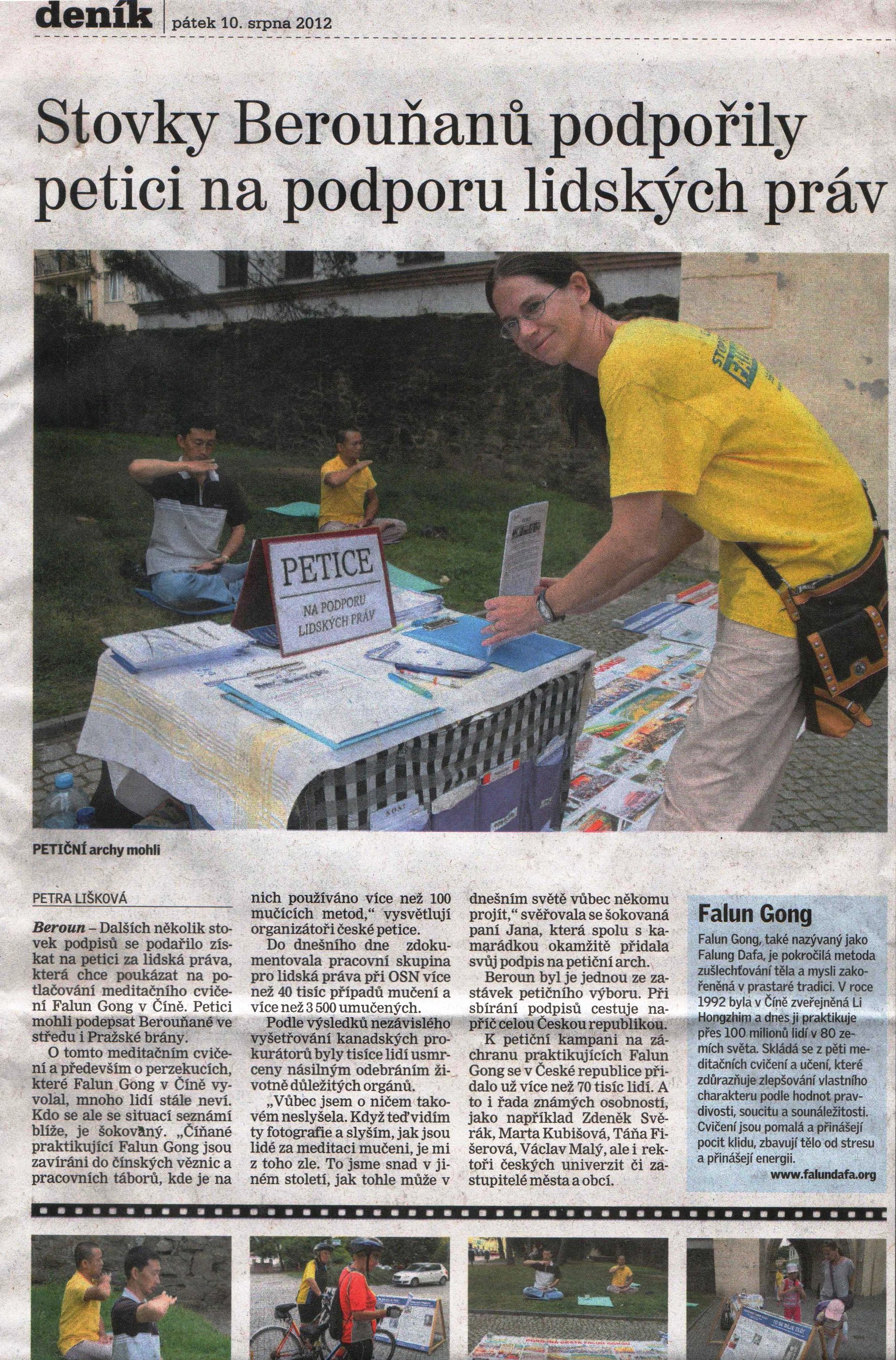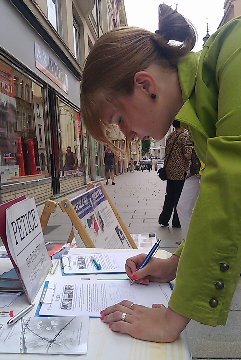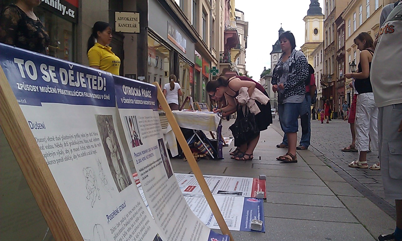 征签活动在贝隆市中心的“布拉格城门”旁边举行,《贝隆日报》在八月十日借此活动报道了法轮功和中共对法轮功的迫害。