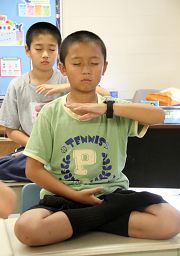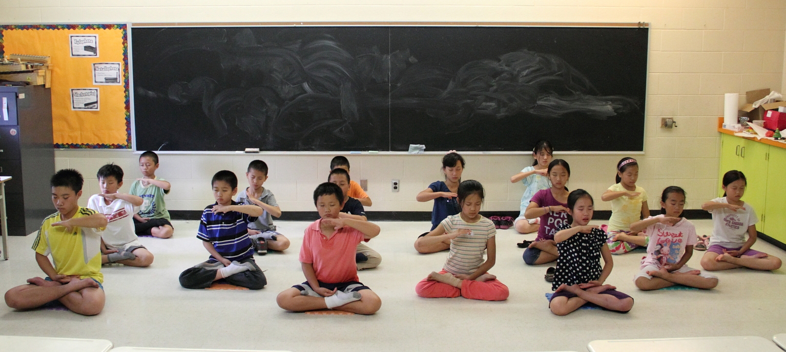 在明慧学校。早上八点四十五分开始炼四十五分钟动功(第二套功法只炼十五分钟),然后在教室学法一个小时。下午三点半开始炼四十五分钟静功。辰辰说:“每天早上炼动功的时候,感觉到能量场很强,冲灌的时候一点都不费力气,感觉手轻飘飘的,非常舒服。”