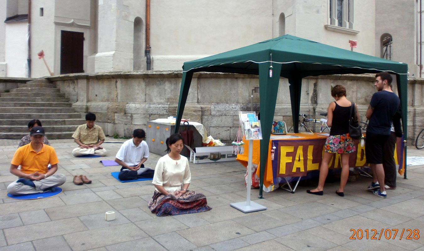 有一位德国女士,看学员静静地炼功看了好长时间,后来她对学员说,她一直对修炼文化感兴趣,而且在二十多年前她曾经去过中国很多个城市,她说中国现在变化很大,但真正有价值的东西却在流失。得知在雷根斯堡能够免费学习法轮大法的功法后,她非常高兴,并说一定会来学的。