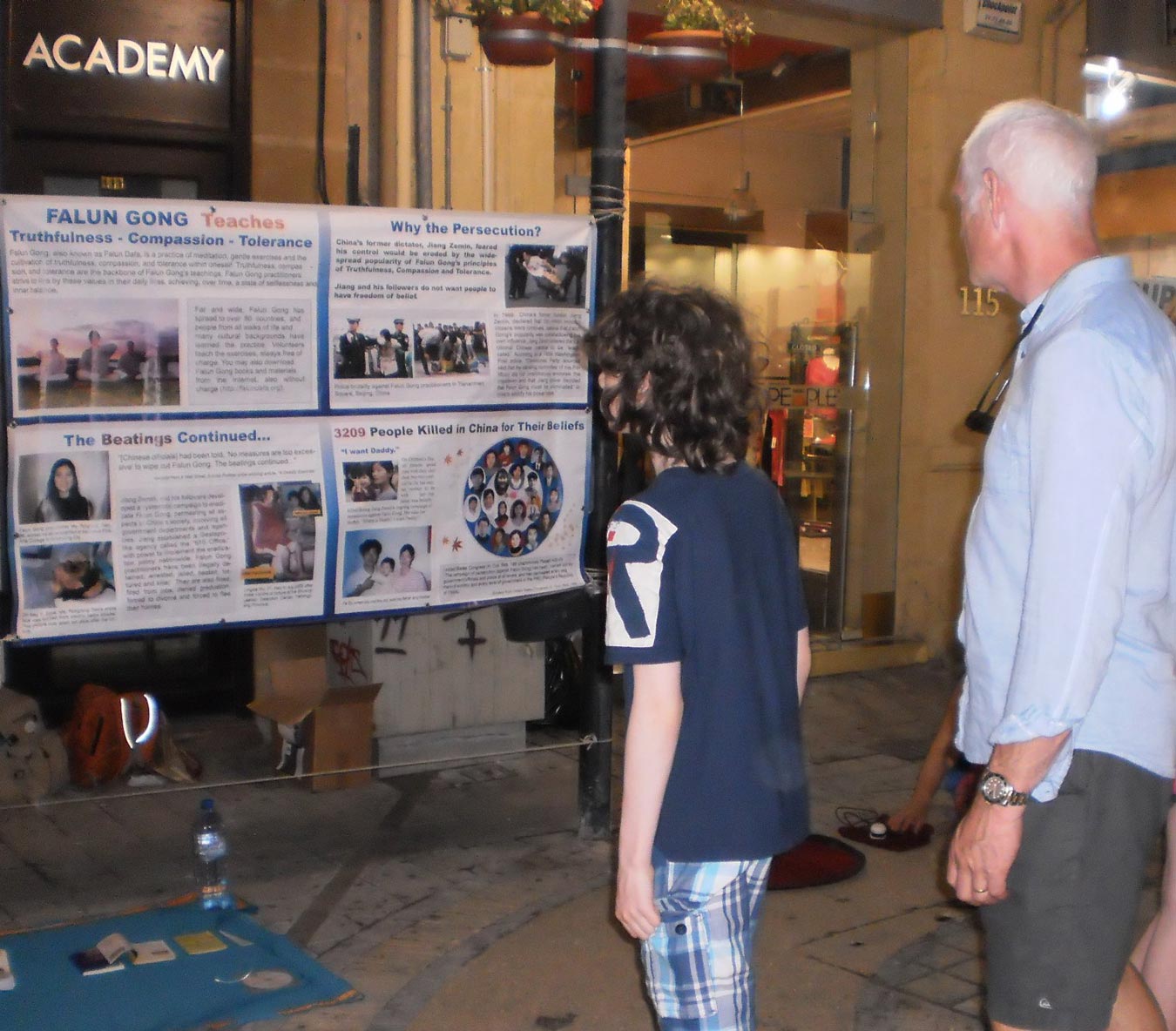 布置好展板后,一些学员演示法轮功功法,一些学员向民众介绍法轮功在大陆遭受中共迫害的真相。祥和的炼功音乐和优美的功法演示吸引了很多市民和游客,他们认真地看展板,有些市民表示不可思议,问为什么中共要迫害这么善良的群体;也有人表示非常愤慨,几乎不敢相信还有这样残酷的迫害发生。不少游客签名支持反迫害。